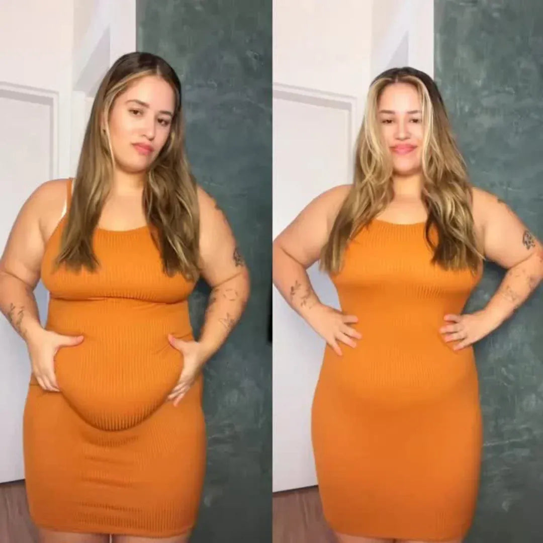 Eu compro roupas tamanho M, mas a minha barriga sempre aparecia. Com a Elegança, finalmente posso usar o que quero. Não há efeito «salsicha», é suave e natural.